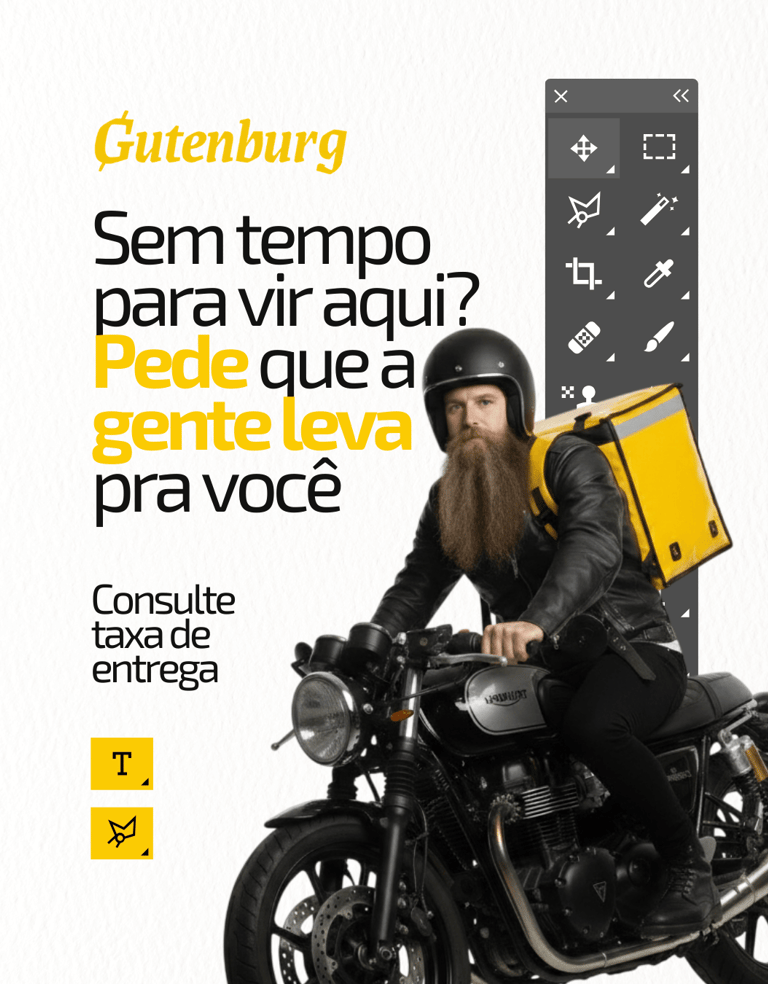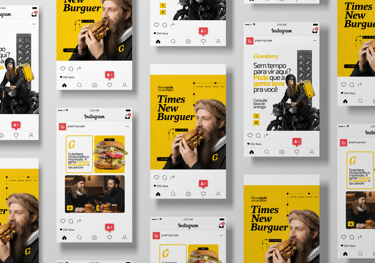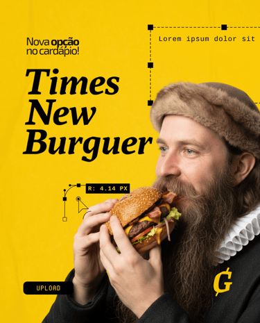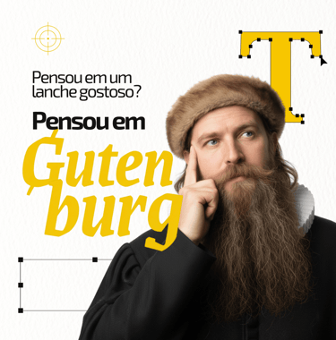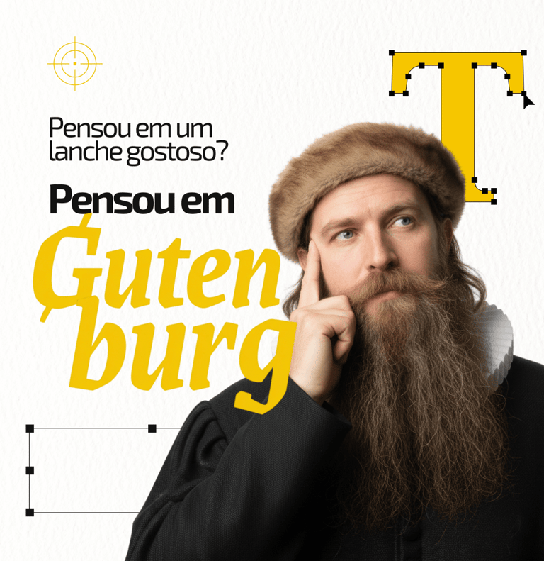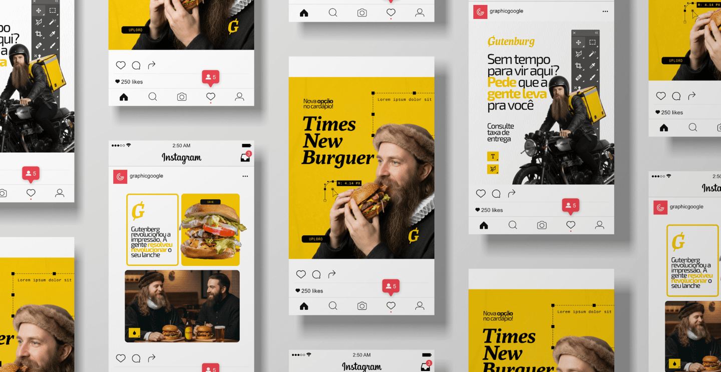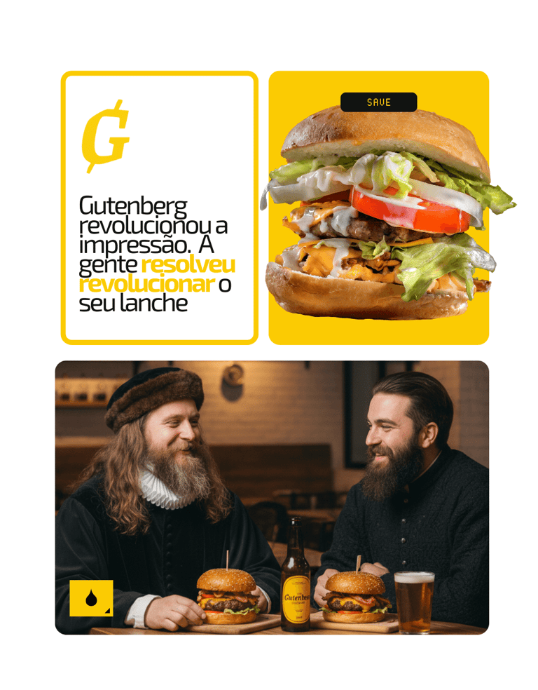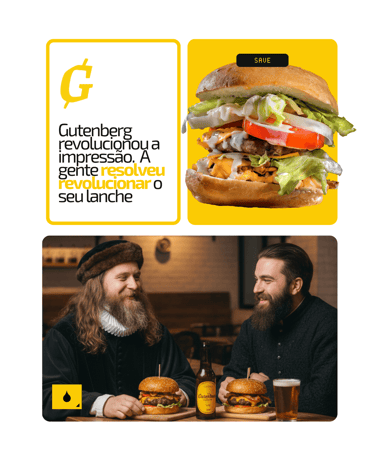 Os detalhes dessa relação com o design começam com o nome escolhido para a marca: Gutenburg (Gutenberg + Hambúrguer), que é a junção entre o nome de Johannes Gutenberg (inventor da máquina de impressão tipográfica - 1430) e se você não conhece esse carinha, foi só o inventor que revolucionou a produção de materiais impressos. Os nomes que dos itens do cardápio também usam elementos do design para compô-los como os hambúrgueres Lorem Ipsum, Times New Burger e as cervejas Seripa e Golden Ratio.
