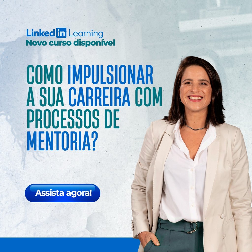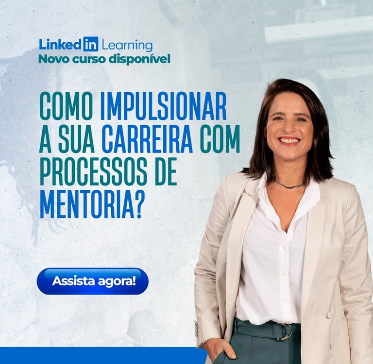 • Nova capa para perfil pessoal do LinkedIn comunicando ao lançamento do novo curso "Como impulsionar sua carreira com processos de mentoria?"